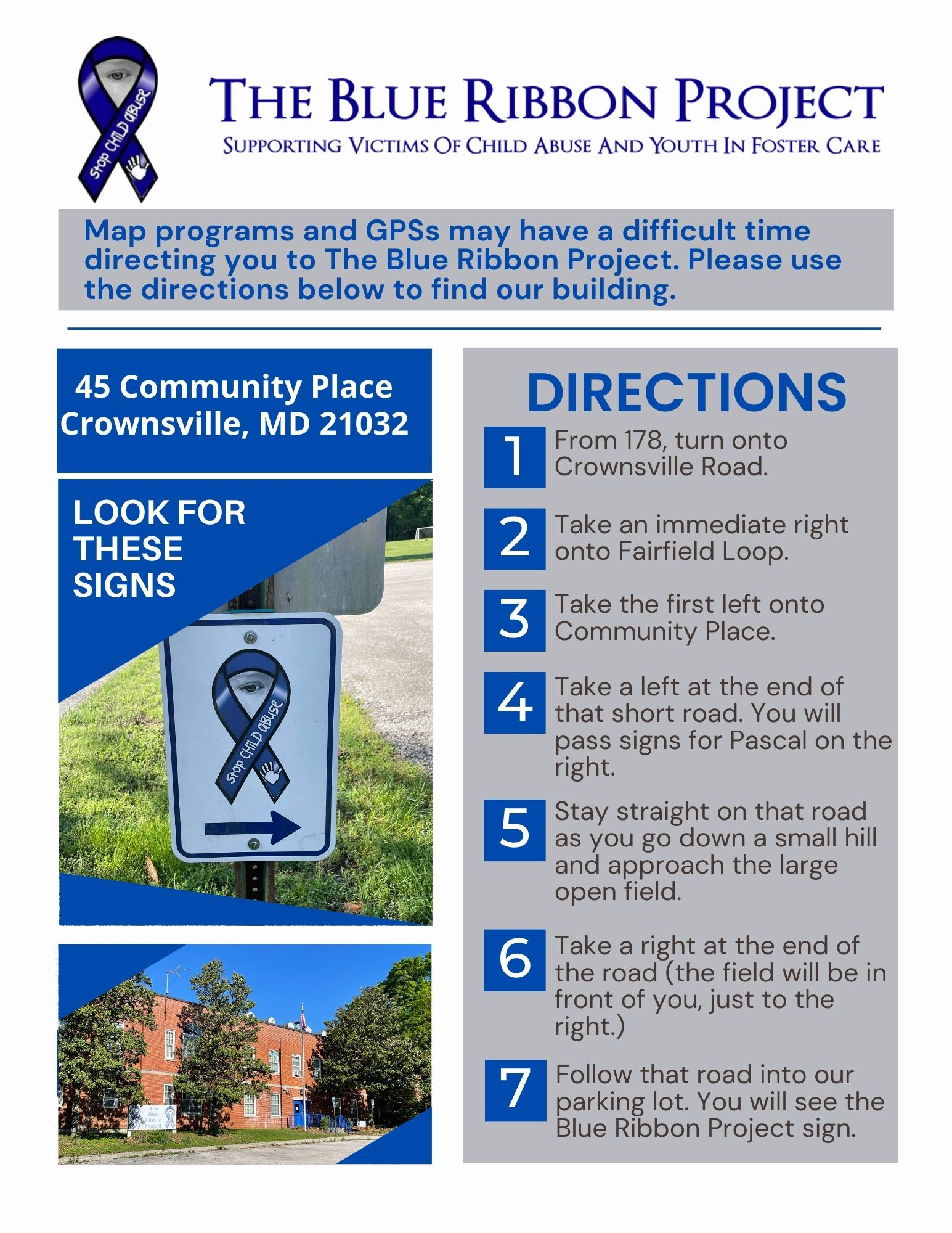 Our physical address is 45 Community Place, Crownsville, and your GPS should take you directly to our front doors. When you arrive, you will see a large Blue Ribbon Project sign and a sign for Mirah's Closet. Below is a graphic with directions to our building. If you are visiting to drop off a donation after hours, we have a donation box at the rear of the building. When looking at the larger signs to the left, you will see a small driveway. There is a sign that says "Admin Offices" at the entrance to this driveway. Follow that driveway around the building and up a small hill to another parking lot. At that parking lot, you will see a blue door. Next to the door is a large brown bin. Donations can be placed inside of that bin.
